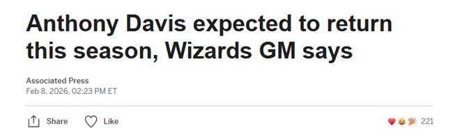 - | 反轉!奇才總經理宣布濃眉本賽季能復出 此前有報道稱他提前報銷